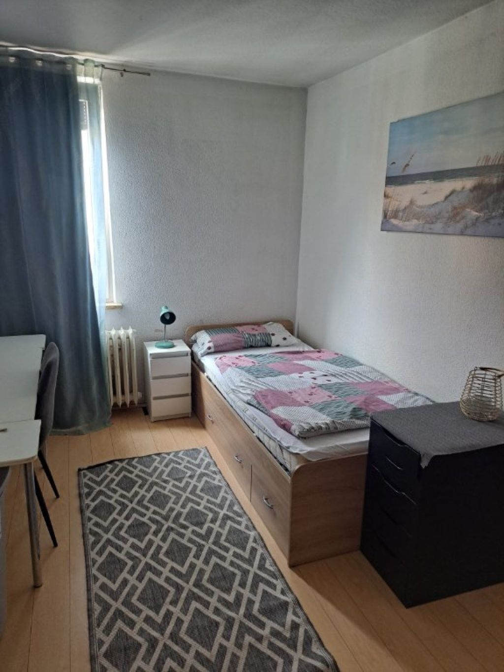 Bei uns erwartet dich ein schönes, helles, geräumiges, möbliertes -WG-Zimmer in einer (mehrsprachige) 4-er WG. Es ist nicht zu klein aber auch nicht zu groß. Die perfekte Größe für ein gemütliches WG-Zimmer, in das alles rein passt. Neben dem Zimmer stehen ein Gemeinschaftsraum, eine ausreichend große Küche und natürlich ein Duschbad als Gemeinräume zur Verfügung. Toll möbliert: Ein gemütliches Bett, Schreibtisch mit Stuhl, ein Relaxsessel, sowie ein Kleider- und großer Regalschrank sind bereit...