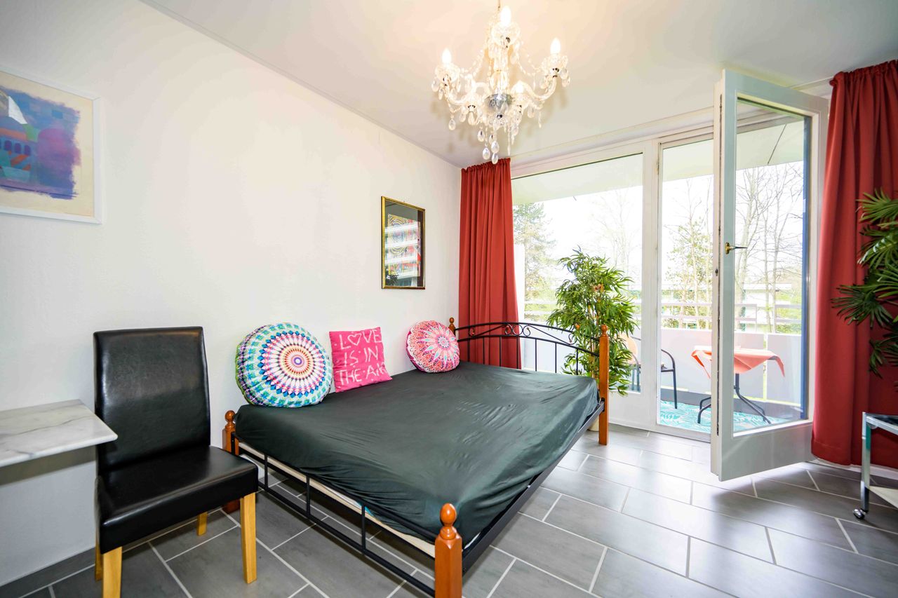 Der Boden der in der 1. Etage liegenden Wohnung beteht aus weißen Fliesen, auch das frisch renoviert Bad mit Dusche ist komplett gefliest. Das Wohn-, Schlafzimmer mit Verdunkelungsgardienen hat eine Fensterfront bis auf den Boden. Der davor liegende Balkon ist ca 6 qm groß und beitet einen Blick aufs grüne.