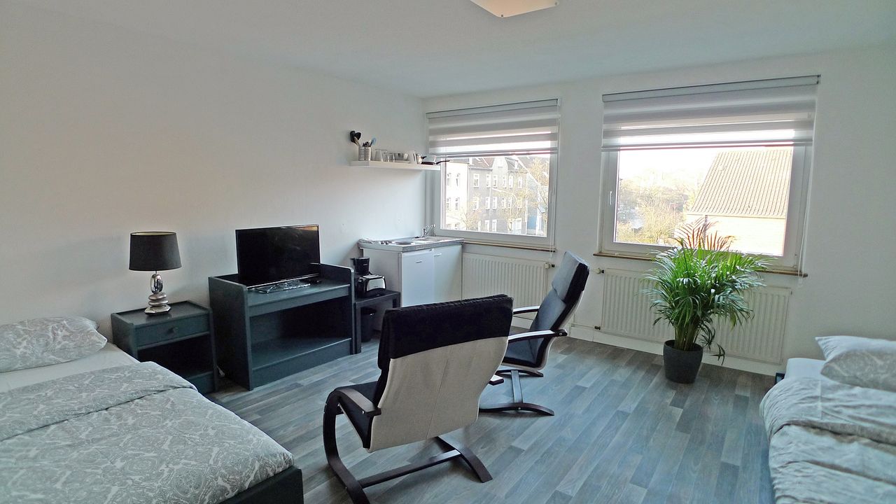 Das Nichtraucherappartement befindet sich im 2. Obergeschoss in Herne-Crange und bietet auf rund 28 Quadratmetern eine gemütliche Unterkunft für ein bis zwei Personen. Der Wohn- und Schlafbereich ist mit zwei Einzelbetten, einer Sitzecke mit TV sowie einer kleinen Essecke ausgestattet. Eine Pantryküche mit Kaffeemaschine, Wasserkocher, Toaster, Geschirr und Besteck steht zur Verfügung. Das Badezimmer verfügt über Dusche und WC. Ein WLAN-Anschluss ist vorhanden. Vom Appartement aus gelangen Sie ...