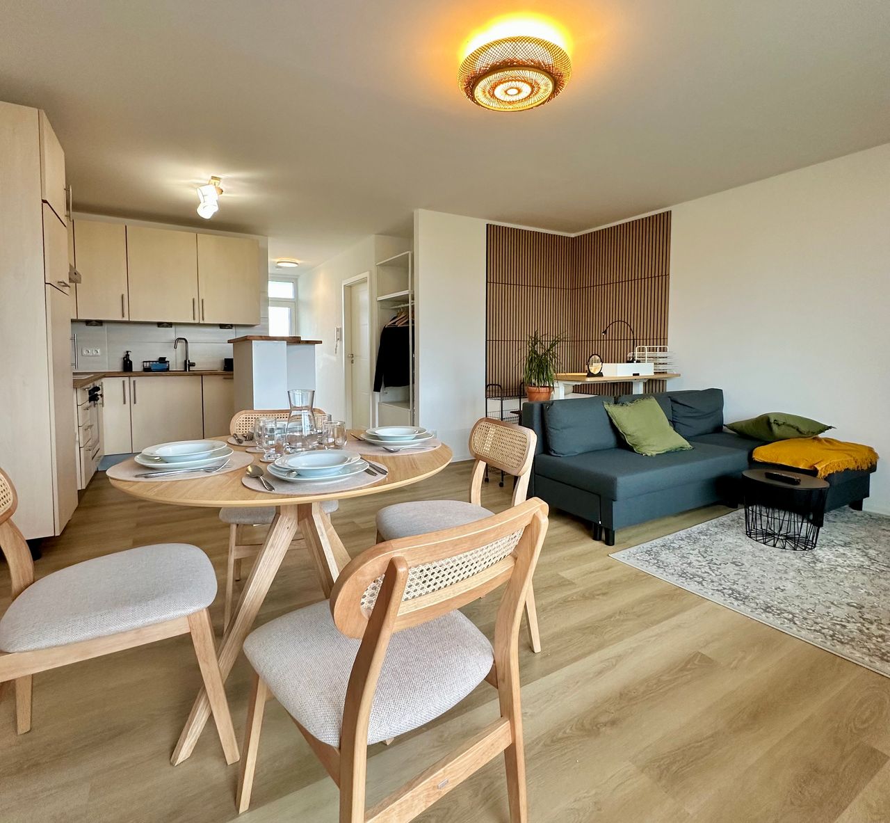 Frisch renovierte, helle Wohnung mit Balkon, Küche, Parkplatz und exzellenter Anbindung Diese hochwertig renovierte Wohnung überzeugt durch ihre moderne Ausstattung. Der Arbeitsplatz verfügt über einen elektrisch höhenverstellbaren Schreibtisch sowie schnelles WLAN (250 Mbit/s Download, 50 Mbit/s Upload) – ideal für produktives Arbeiten im Homeoffice. Ein Smart-TV sorgt für Unterhaltung in der Freizeit. Die moderne Einbauküche ist vollständig ausgestattet und lässt keine Wünsche offen: Toaster, ...