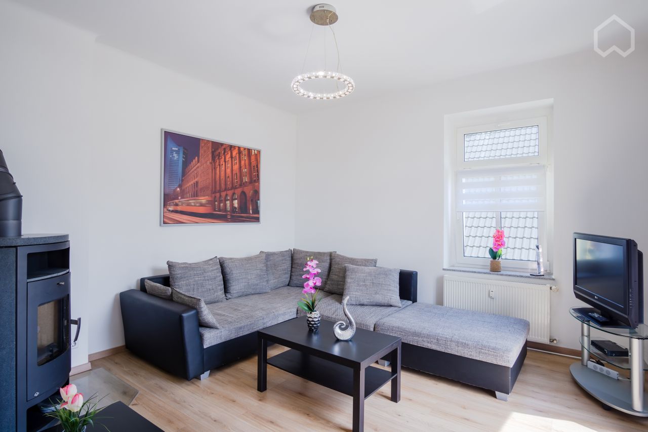 Herzlich Willkommen in der neu möblierte 4 Raum Wohnung mit Stil,Optimal für 4-6 Personen.Die Wohnung hat 2Schlafzimmer,1Gästezimmer,Bad mit Dusche,Wanne sowie Waschmaschine sowie Fußbodenheizung.Wohnzimmer mit großer Schlafcouch,TVsomie Kamin und komplett eingerichteter Küche.Ein Pkw Stellplatz befindet sich direkt vor dem Haus.Die Wohnung befindet sich in Leipzig Burghausen,Einkaufscenter,Arzt,Straßenbahn sowie derwunderschöne Elster-Saale Kanal und Auenwald sind zu Fuß schnell zu erreichen.Di...
