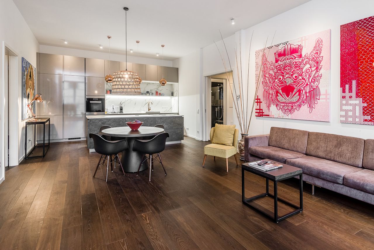 Die Wohnung bietet ein geräumiges Hauptschlafzimmer (Doppelbett) mit angeschlossenem Bad sowie ein weiteres Zimmer, das ideal als Gästezimmer oder Büro dient und über ein separates Badezimmer verfügt. Das Highlight der Wohnung ist die luxuriöse, offene Designerküche mit Miele-Geräten, die fließend in einen eleganten Ess- und Wohnbereich übergeht, welcher mit Pop-Art im asiatischen Stil dekoriert ist. Der benachbarte Balkon, der rund 10 m² groß ist und nach Westen ausgerichtet ist, gewährt einen ...