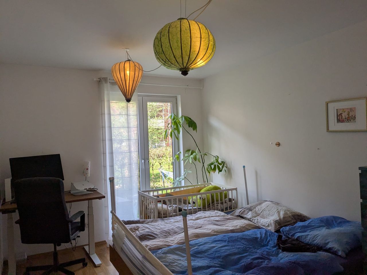 Da wir beruflich ins Ausland gehen, vermieten wir unsere Wohnung voll möbliert. Zu haben sind, auf etwa 75 Quadratmetern: Ein großes Wohnzimmer mit offener Küche, ein Arbeits-/Kinderzimmer (etwa 14 qm) und ein Schlafzimmer (etwa 20 qm), eine Abstellkammer und ein Bad mit Badewanne. Das Kinderzimmer kann zu einem Arbeitszimmer umgewandelt werden. Alle Zimmer gehen zum Garten hinaus. Hier steht eine Hängematte, es gibt ein Hochbeet, eine Terrasse und genug Platz für Gartenliegen, Planschbecken ...