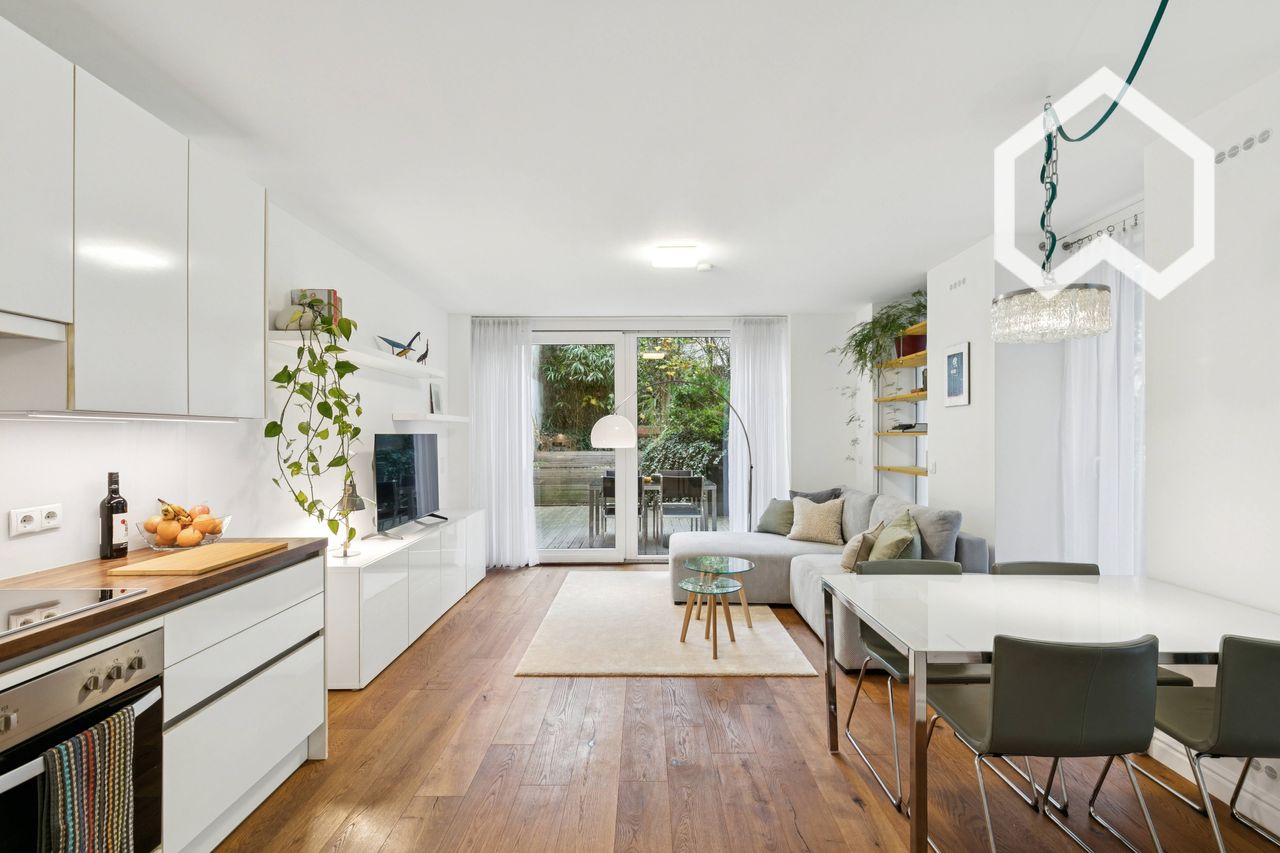Der Blick von der Terrasse ins begrünte Innenhofensemble zeigt sofort den Charakter dieser Wohnung: viel Grün und Ruhe, mitten in einem der lebendigsten Bezirke Wiens. Die vollmöblierte Wohnung (ca. 50 m²) ist hofseitig ausgerichtet und dadurch angenehm ruhig. Der großzügige, loftartige Wohnbereich verbindet Wohnen, Essen und Arbeiten; vom Esstisch aus blickt man direkt ins Grüne, Steckdosen in unmittelbarer Nähe machen den Platz ideal zum Arbeiten im Homeoffice. Im Schlafzimmer befindet sich ...