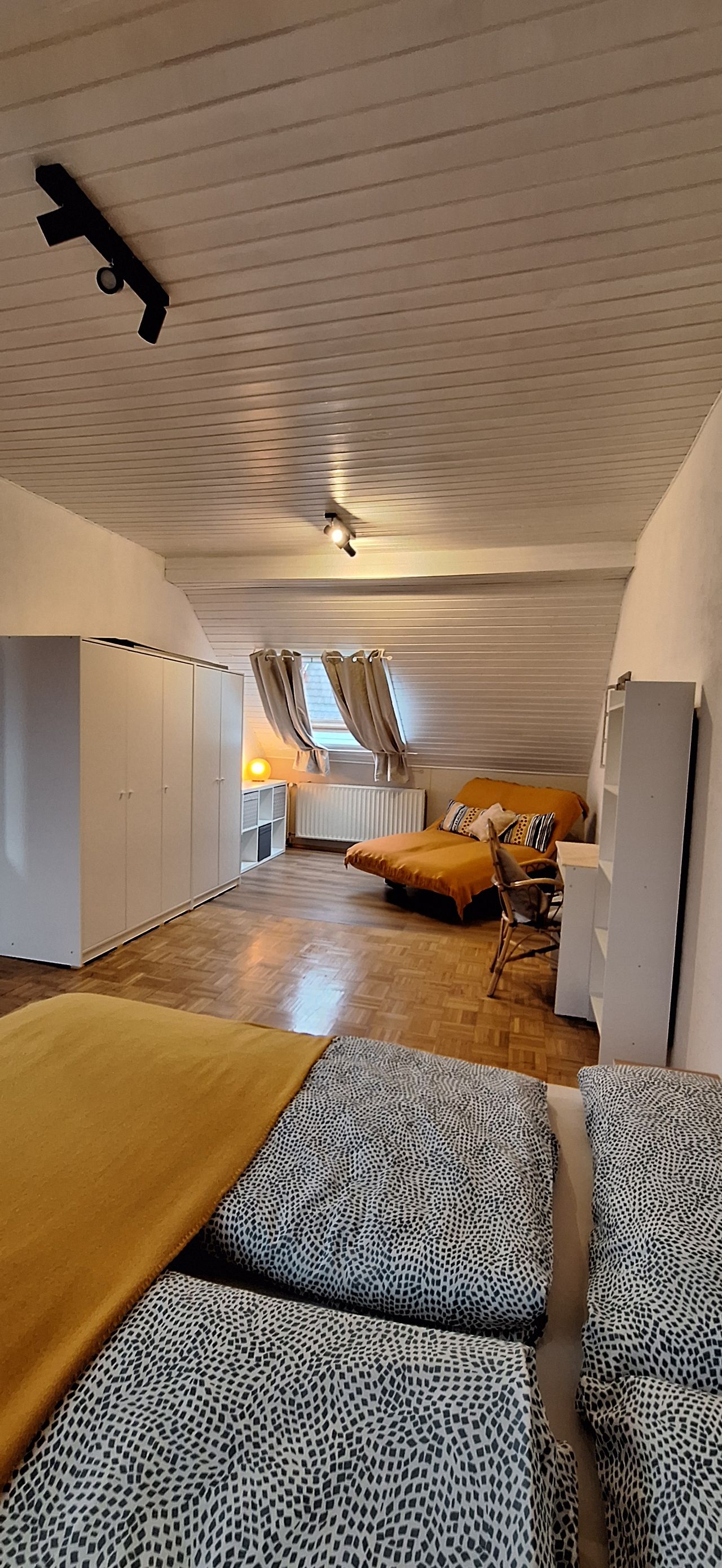 Im 1. Stock befinden sich: Das Badezimmer saniert und neu eingerichtet sowie eine große Einbauküche mit moderner Ess-Theke, ein modernes Esszimmer bestehend auseinem Esstisch mit sechs Stühlen, Stehlampe und Kirschholz Vitrine sowie ein Wohnzimmer bestehend aus einer bequemen Eck Couch mit Kissen und Decke, 2 kleine Tische und Lampe, ein Sideboard mit TV und Licht. Im eigenen Flur Obergeschoss führt die Treppe zum Dachgeschoss mit einem großen Schlafzimmer mit Bett 160x200 und zwei Nachttischen...