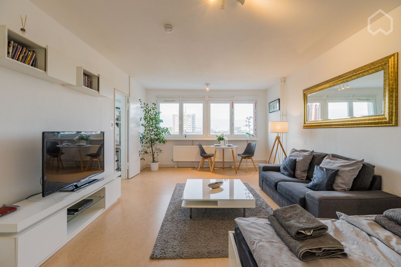 ... TV with Netflix 100 DVds Comfortable bed for 2 Person. New sofa dining table with 4 chairs there is wardrobe in the living room and one in the small hall.