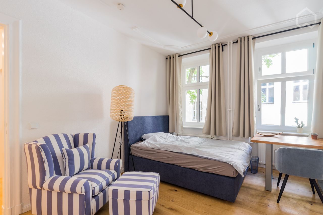 Diese wunderschöne 1-Zimmer Altbauwohnung bietet alles was man zum Wohlfühlen braucht. Der originale Parkettboden und die hohen Decken mit Stuck verleihen der Wohnung das typische berliner Flair und durch die großen Fenster und die vielen Lampen strahlt die Wohnung eine herrliche Wärme aus. Die komplett eingerichtete Wohnung bietet Platz für eine Person. Bettwäsche, sowie Kissen und Decken sind auch dafür ausreichend vorhanden. Die Küche ist vollständig ausgestattet mit hochwertigen Einbaugerä...