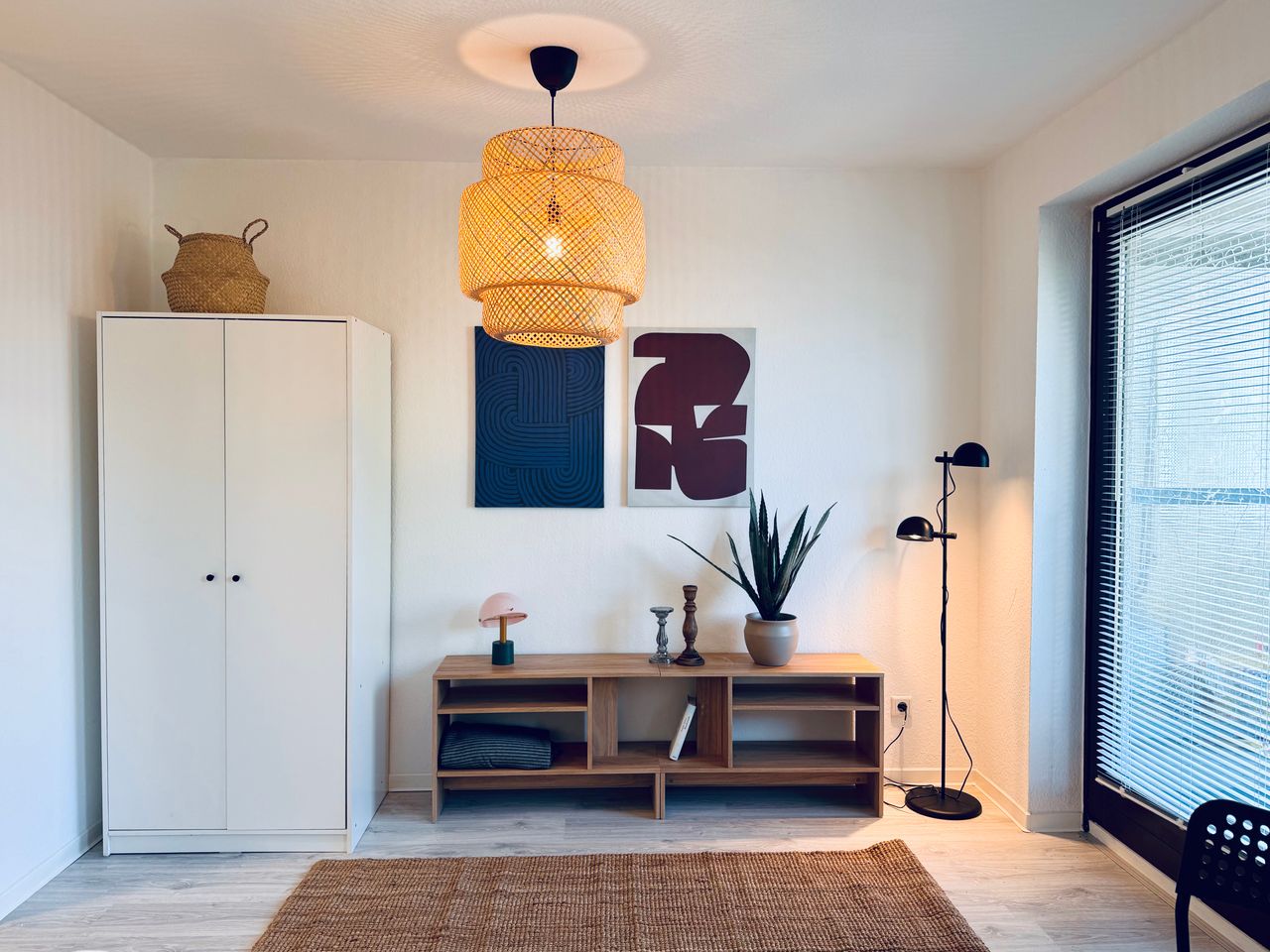 Voll möbliertes und gemütliches Studio-Apartment im modernen Stil. Das Apartment bietet alles, was man für einen komfortablen Aufenthalt braucht: ein bequemes Bett, Sitzbereich, Kleiderschrank sowie eine vollständige Ausstattung mit Geschirr und Besteck. Die helle, weiße Einrichtung mit dekorativen Akzenten in Blau und natürlichen Materialien sorgt für eine angenehme Atmosphäre. Ideal für Pendler, Studenten oder Kurzzeit-Aufenthalte.