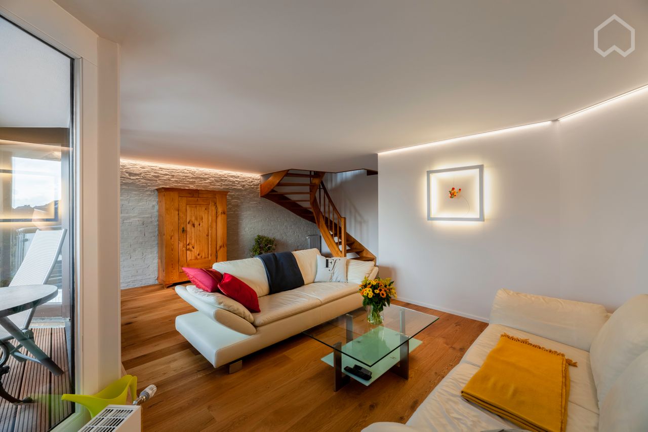 104 m², drei Räume im zweiten Stock gelegen. Das Apartment ist ruhig gelegen in einer verkehrsberuhigten Sackgasse. Fußläufig ist der Königsforst als Naturschutzgebiet schnell zu erreichen. Es ist perfekt für einen Single oder ein Paar, dass eine hochwertige möblierte Wohnung auf Zeit sucht. Das Apartment ist vollständig eingerichtet mit vielen hochwertigen Highlights für ein komfortables Leben. - ein großer Flat Screen (65 Zoll) und dimmbares Lichtsystem im Wohnzimmer. - Neue Küche mit professi...