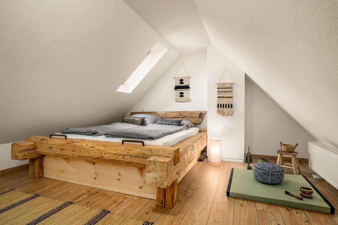 Klassische Maisonette-Wohnung über zwei Etagen im Dachgeschoss eines Mehrfamilienhauses. Die untere Etage bietet einen offen gestalteten Wohnbereich mit großer Küchenzeile und Essecke, sowie ein Bad mit WC und Badewanne. Die obere Etage ist über eine Raumspartreppe erreichbar und verfügt über einen Schlafbereich mit einem handgefertigten Holzbett im rustikalen Stil. Hier findest du Entspannung nach einem langen Arbeitstag oder einer Sightseeing-Tour durch Kassel. Öffne die Fenster und lausche d...