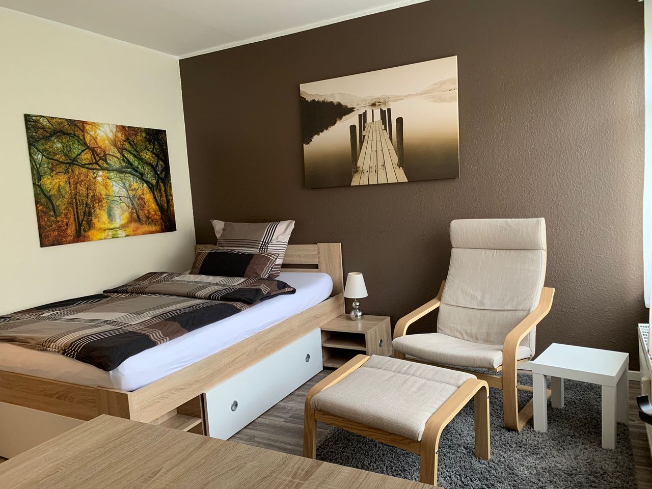 Das Apartment ist 25 qm groß und befindet sich in der Hochparterre Im Pannenhack 96 in Rösrath. Es verfügt über einen kleinen Eingangsbereich mit Garderobe, einem Badezimmer mit Dusche, einer Einbauküche und einem Wohn-Schlafraum für eine Person. Die Einbauküche besteht aus einem 4-Zonen Kochfeld, einem Kühlschrank mit Gefrierfach, Senseomaschine, Wasserkocher, Toaster und Backofen. Geschirrhandtücher sind ebenfalls vorhanden. Die Küche ist mit Besteck, Geschirr, Gläsern, Töpfen und Pfannen kom...