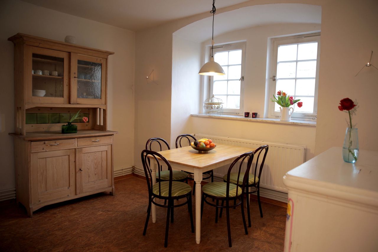 Einfache individuell eingerichtete Ferienwohnung (50qm) mit 1 Schlafzimmer und Schlafcouch für max. 4 Personen in einem kleinen, romantischen Renaissanceschloss in Mansbach inmitten der nordhessischen Kuppenrhön nahe dem Grünen Band. Die Wohnung verfügt über Heizkörper für den Grundbedarf, der Holzöfen sorgt für gemütliche Wärme. Wanderreiter sind willkommen. Pferde können auf dem Gelände untergebracht werden.