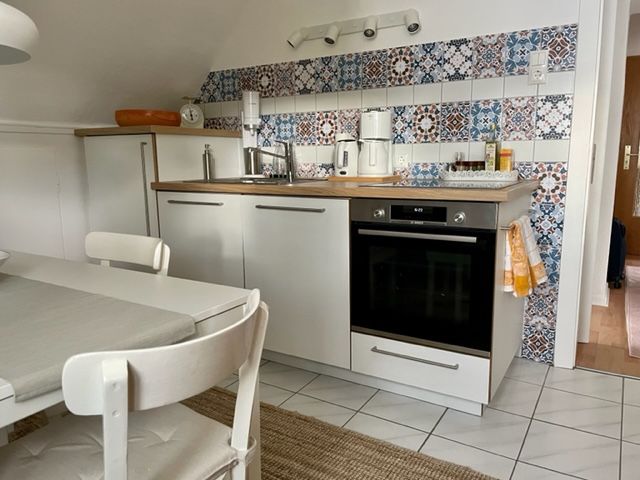 Die gemütliche Dachgeschosswohnung ist in einem Top Zustand und bietet allen Komfort und eine gehobene Ausstattung. Das Bad ist ein weißes, modernes Duschbad. Es gibt eine Garderobe vor der Wohnungstür und eine 2. kleine im Flurbereich. Das Schlafzimmer ist mit einem bequemen Queen-Size Bett ausgestattet und Bettzeug sowie Bettwäsche sind ausreichend vorhanden. Die Küche ist mit einem neuen Herd (Cerankochfelder), selbstreinigendem Ofen und Kochtöpfen/Pfannen sowie Kühlschrank mit Eisfach a...