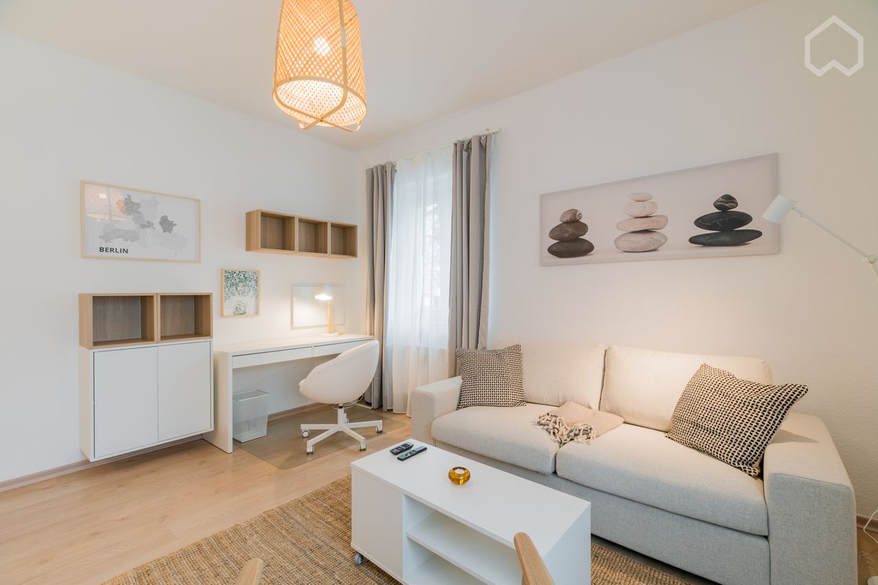 ///ENGLISH VERSION BELOW/// AUSSTATTUNG Diese stilvolle und luftige 2-Zimmer-Wohnung hat schlichtweg eine Menge Charme. Die Einrichtung ist zu 100% neu, die Zimmer wurden komplett renoviert. Die Wohnung hat eine perfekte, klare Trennung der verschiedenen Wohnbereiche und eine sinnvolle Integration von Stauräumen. Sie ist in wärmenden Beige- und milchigen Weißtönen gehalten, was ihr einen wirklich gemütlichen skandinavischen Look verleiht. Das Ergebnis ist ein Raum, der sowohl nachhaltig als au...