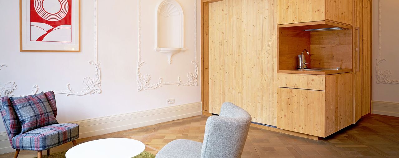 Kamin- und Wohnzimmer mit Illustrationen von Kathi Käppel, offene Küche & Esssalon für individuelle Kochabende, eigenes Kino mit kleiner Bar, Waschraum, Fitnessraum & Yoga-Kurse, Zimmer mit Kitchenetten, verwunschener Garten & Dachterrasse, unverwechselbare Bewohner, zeitgenössische Kunst & Altbaustuck. Die im ersten Stock gelegene Suite lebt von dem Kontrast aus den weißen, stuckverzierten Wänden und den klaren, roten Akzenten des Interieurs. Die alte, zweiflügelige Zwischentür beherbergt ein ...