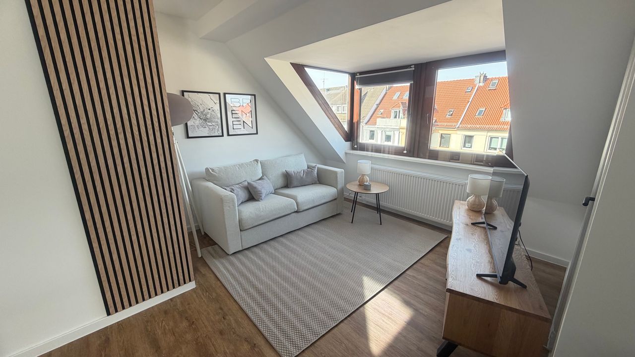Neu sanierte, sehr ruhige helle und hochwertig komplett neu ausgestattete 2- Zimmer Wohnung mit 50qm Wohnfläche im Dachgeschoss eines gepflegten Altbremer 3-Familienhauses in der Bremer - Neustadt mit tollem Ausblick. Neue Fenster mit Dreifachverglasung, Fassadendämmung Ideal für Airbus oder Airportstadt Bremen Mitarbeiter auf Zeit Helles Wohnzimmer mit gemütlichem Sofa, XXL Sessel, TV-Board, Waipu TV und hellem Arbeitsplatz Das Schlafzimmer liegt nach hinten raus und hat einen kleinen Balkon...
