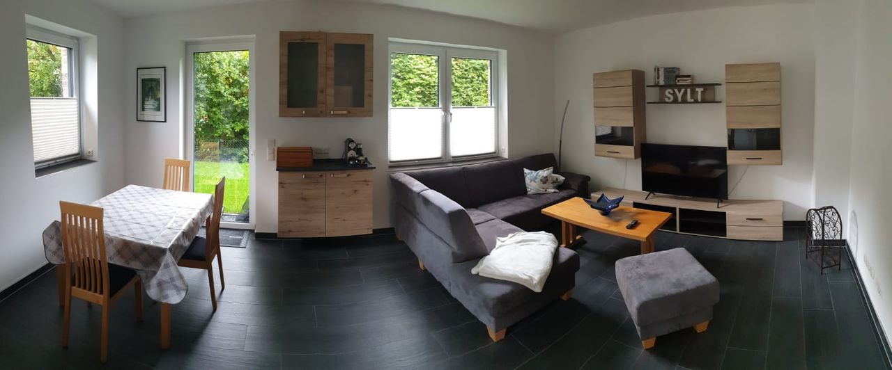 Die 2 bzw. bei Bedarf 3 Zimmer Einliegerwohnung erstreckt sich über zwei Etagen, hat einen separaten Hauseingang und eine Größe von ca. 60m² bzw. bei Anmietung von drei Zimmern von 80m². Die Wohnung ist mit einer komplett eingerichteten Küche, Geschirrspüler, Mikrowelle, Waschmaschine, Trockner, Fernseher und W-LAN-Zugang ausgestattet. Alle Fenster haben blickdichte Plissees und elektrische Außenrolläden. Im Erdgeschoß befindet sich das ebenerdige Duschbad, ein Schlafzimmer und das Wohnzimmer m...