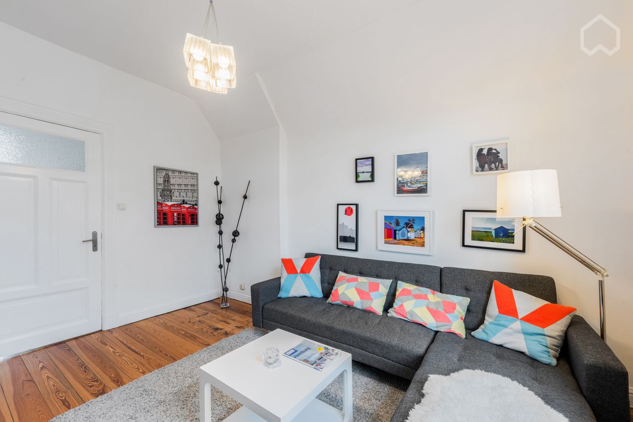 Das schicke Apartment liegt in der obersten Etage einer hübschen Jugendstil-Villa. Es ist neu, hell und modern ausgestattet - ein Ort zum Wohlfühlen. Es gibt 3 Zimmer, eine Wohnküche und einen Balkon. Das moderne Apartment ist mit seinen 75 m² geräumig, aber gleichzeitig wohnlich und gemütlich. Bei Bedarf stellen wir gern ein drittes Bett in einem separaten Zimmer zur Verfügung. In der Miete inbegriffen sind: - WLAN - Neue, komplette Einrichtung - Flatscreen-TV und Radio - Handtücher und Bett...