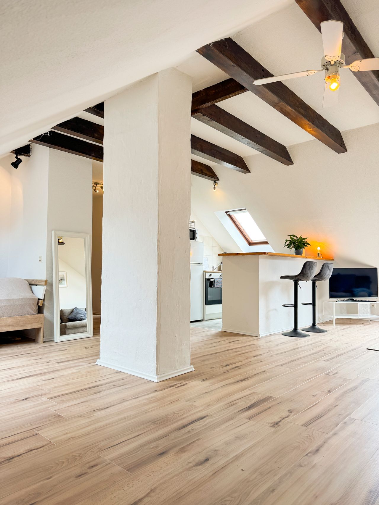 Highlights der Wohnung: Frisch renoviert – Erstbezug Ca. 49 m² Lichtdurchflutetes Loft-Studio Ausklappbarer Balkon mit Blick ins Grüne Voll ausgestattete Küche mit Herd, Mikrowelle, Kühlschrank, Kaffeemaschine, Wasserkocher, Toaster, Geschirr & Besteck Modernes Bad mit Fenster, Waschmaschine, Badewanne & Dusche, neuem WC und Waschbecken, Amaturen Smart-TV, Highspeed-Internet (WLAN) inklusive Schreibtisch / Arbeitsplatz für Homeoffice Waschmaschine In der Wohnung vorhanden PKW-Stellplatz ...