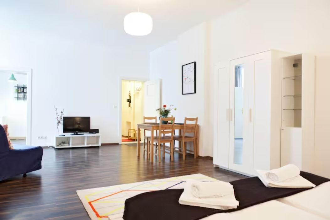 Neue Ferienwohnung in Katzlerstr. / Yorckstr. Diese äußerst verkehrsgünstig gelegene Ein-Zimmer-Wohnung liegt im Schöneberger bei S- und U-Bahnhof Yorckstraße und ist frisch renoviert. Sie besteht aus einem großen Wohnraum, einer voll ausgestatteter Küche, einem Wannenbad. Die Wohnung befindet sich in EG und ist übrigens zum Innenhof hin gelegen, so dass Sie trotz der zentralen Lage ruhig schlafen können! Wohnraum: -Bettwäsche und Handtücher - Doppelbett - Sofa ( Schlafsofa ca. 1,40 m) - gr...