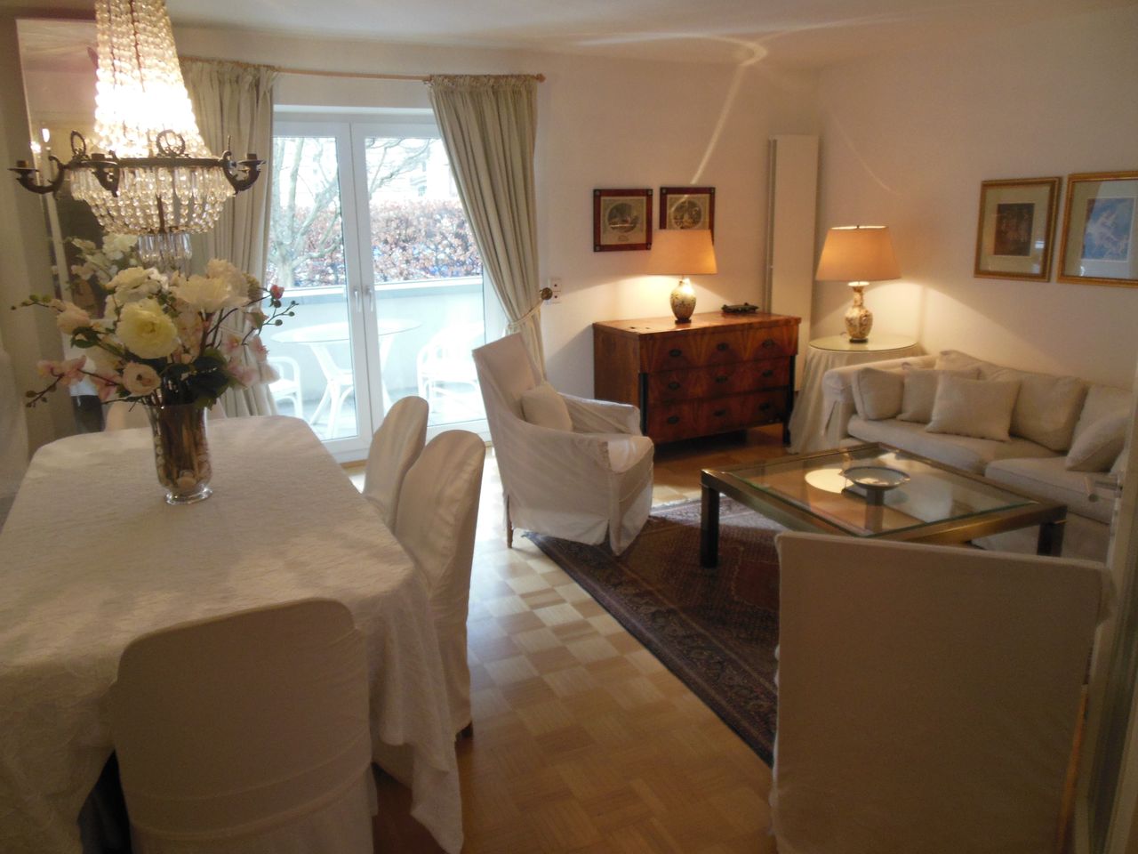 Das Apartment ist mit hochwertigen Einrichtungsgegenständen ausgestattet und verfügt über einen großen Wohn- und Essbereich, ein geräumiges Bad, voll ausgestattete Einbauküche mit Spülmaschine, einen Balkon und einen Terrasse zum Garten. Das Apartment bietet kostenfreies W-Lan und eine Waschmaschine mit Trockner. Das Apartment hat insgesamt 62 qm.