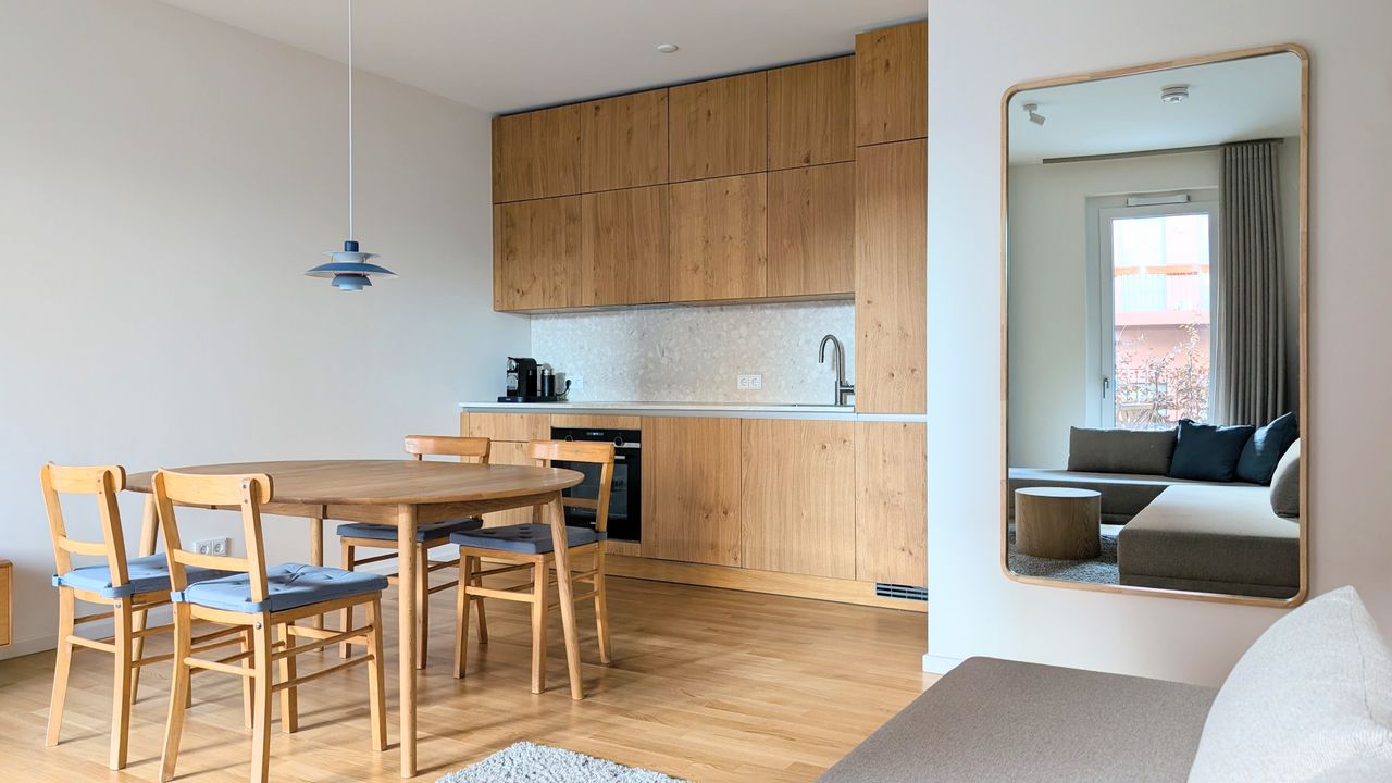 Modern ausgestattete Wohnung im Erdgeschoss eines neuen Wohnensembles in Berlin-Grünau. Die Einheit bietet 60 m² Wohnfläche mit offenem Wohn-/Essbereich, voll ausgestatteter Einbauküche, separatem Schlafzimmer sowie einem Bad mit Wanne. Hervorzuheben ist die großzügige 40 m² Terrasse mit Blick ins ruhige Innenhofgrün. Wenige Schritte zur Dahme, umgeben von Park- und Wasserflächen, ideal für Spaziergänge und sportliche Aktivitäten. Sehr gute Erreichbarkeit des Flughafen BER in ca. 15 Minuten mit ...