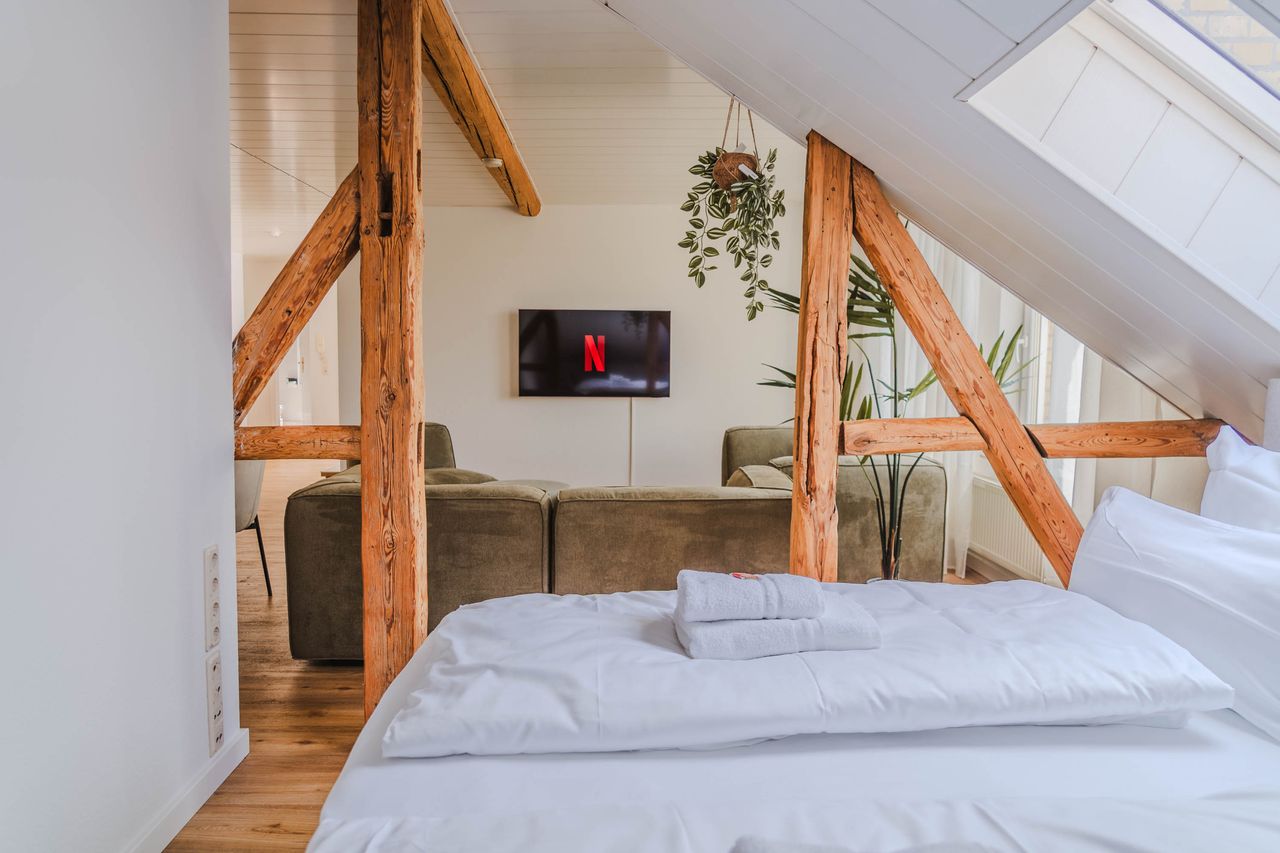 Willkommen in Ihrer gemütlichen Penthouse Wohnung in Hildesheim! Diese großzügige 120 qm große Wohnung bietet viel Platz zum Wohlfühlen. Drei Schlafzimmer, ein helles Wohnzimmer und eine praktische Küche sorgen für ein angenehmes Wohngefühl. Highspeed-WLAN, TV und eine schöne Dachterrasse laden zum Entspannen ein. In zentraler Lage mit privatem Parkplatz – ideal für Familien und Geschäftsreisende!