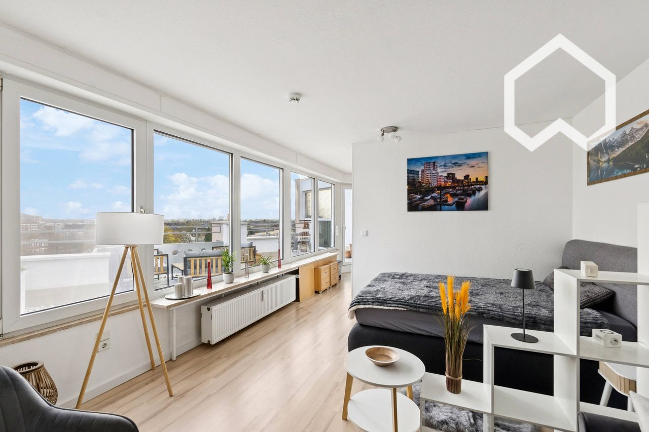 Ruhige, vollmöblierte Wohnung mit 9 m Fensterfront und programmierbaren Sonnenblenden, Wohn-/ Schlafbereich, Küche, Diele, Bad/ WC, begrünte, uneinsehbare, 24 m² Sonnenterrasse mit Südlage und Weitblick inkl. Terrassenmöbel, Aufzug, Waschküche im Haus. Trotz der sehr zentralen Lage der Wohnung ist sie besonders ruhig. Volle Infrastruktur vorhanden, Bus, Bahn, Zug, Flughafen sind in 3 min errreichbar, ebenso wie Auffahrt zur Autobahn, Messe in 5 min erreichbar. Die Wohnung liegt in unmittelbarer...
