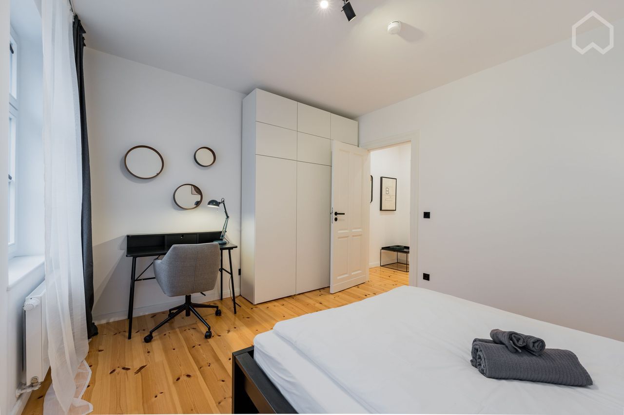 This lovely 2-bedroom shared apartment is located in a renovated listed monument and offers a fully equipped open kitchen connected to the living room which invites you to relax after a busy day in the heart of Berlin. This area features a nice dining table, as well as a cozy couch and Smart TV. The kitchen is fully equipped with any kitchen utensils such as coffee machine, water boiler, toaster, a small dishwasher and refrigerator with freezer. The bedrooms are equipped with a super comfortable...
