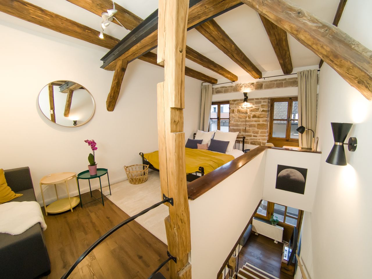 Willkommen in unserer kleinen Remise in der malerischen Altstadt von Ettlingen. Das Denkmal geschützte Haus aus dem 17. Jahrhundert war in alten Zeiten Stall und Kutschengebäude des ältesten Gasthauses von Ettlingen. In den historischen Räumlichkeiten sind individuelle Wohnungen entstanden, die den originalen Charme von Sandsteinwänden und Holzbalken mit allen Annehmlichkeiten der heutigen Zeit kombinieren. Die Unterkunft Die ca. 55 qm große Maisonette-Wohnung erwartet Sie mit einer kleinen, ab...