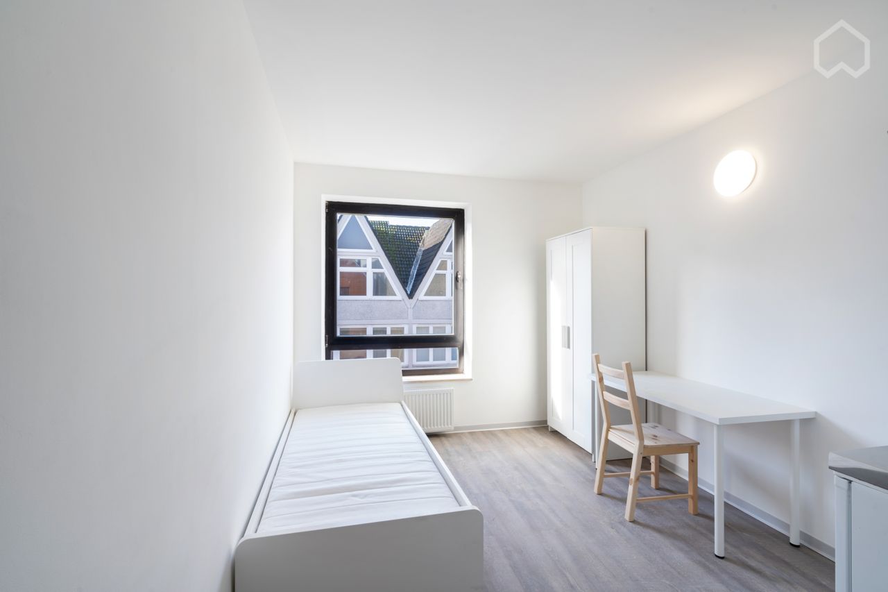 See english version below. Das gemütliche Studenten-Apartment in der Kieler Altstadt bietet unseren Mietern ein günstiges und bequemes Zuhause. Dazu gehören ein kombinierter Wohn- und Schlafbereich, mit Bett, einem großen Kleiderschrank sowie einem Arbeits- und Esstisch mit Sitzgelegenheit. In der angrenzenden Küchenzeile gibt es einen Herd mit Dunstabzugshaube und Kühlschrank. Auch über ein eigenes Bad mit Dusche verfügt das Studenten-Apartment. Das Boardinghouse befindet sich direkt in der A...