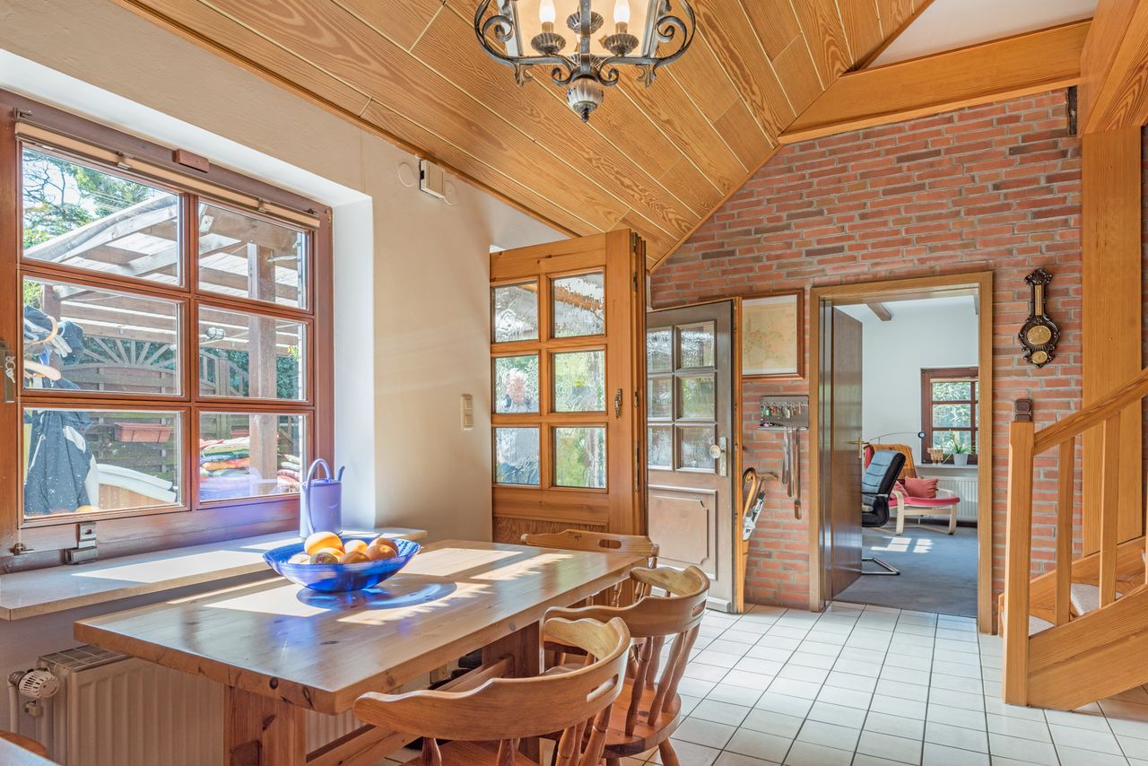 Wunderschöne Wohnung in einem 3-Familien Reetdachhaus auf einem großen Grundstück gelegen mit Garten, Terrasse und Carport. Sehr ruhige und idyllische Lage mit gutem Anschluss zu den öffentlichen Verkehrsmitteln. Das Reetdachhaus wurde um die 1888 erbaut und 1985 komplett saniert. Die Wohnung geht über 2 Etagen (Erdgeschoss und 1.OG) und besitzt sowohl Teppich als auch Fliesen. Helles gemütliches Wohnzimmer mit Sofa, Sessel, Couchtisch, Wandregal, Schreibtisch und Flat-TV. Vollausgestattete Küc...
