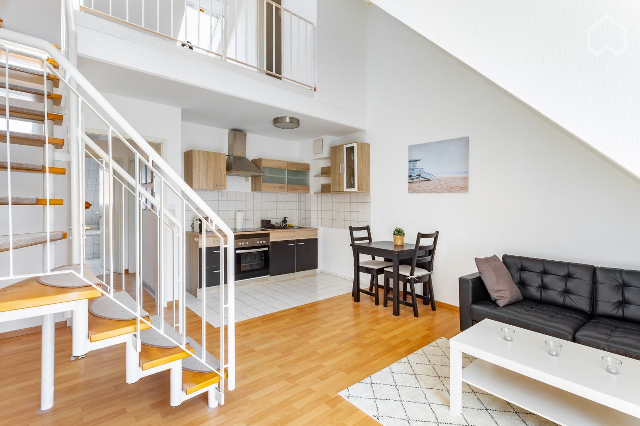 Stilvolles, großartiges Apartment mitten in Fürstenwalde/Spree Die wunderschöne Dachgeschoss-Maisonette Wohnung mit zwei Zimmern / 58 m2 und bester Lage mitten in Fürstenwalde/Spree wurde 2021 frisch renoviert und mit neuen Ikea Möbeln hochwertig eingerichtet. Die Wohnung hat ein geräumiges helles Wannenbad, ein Schlafzimmer und einen großen Wohnzimmerraum mit angrenzender Galerie und Südbalkon. Von dort aus kann man zum verdienten Feierabend den Blick in den angrenzenden Park genießen. Das Sch...