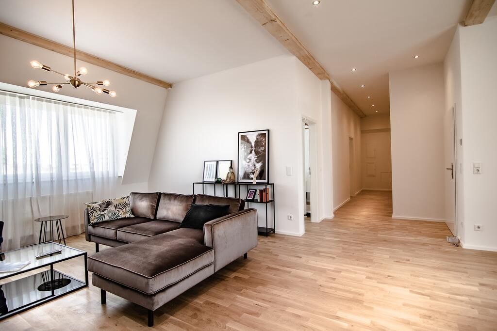 Das 105 m² große Penthouse am Wehrhahn 71 überzeugt durch ein offenes Raumkonzept, viel Tageslicht und stilvolle Details wie sichtbare Holzbalken und hohe Decken. Der großzügige Wohn- und Essbereich ist modern eingerichtet und geht fließend in die voll ausgestattete Küche über. Diese verfügt über eine Herdplatte, eine Mikrowelle mit Ofenfunktion, Geschirrspüler, Kühlschrank, Toaster und Espressomaschine. Das Penthouse bietet zwei separate Schlafzimmer, jeweils mit komfortablen Doppelbetten, hoc...