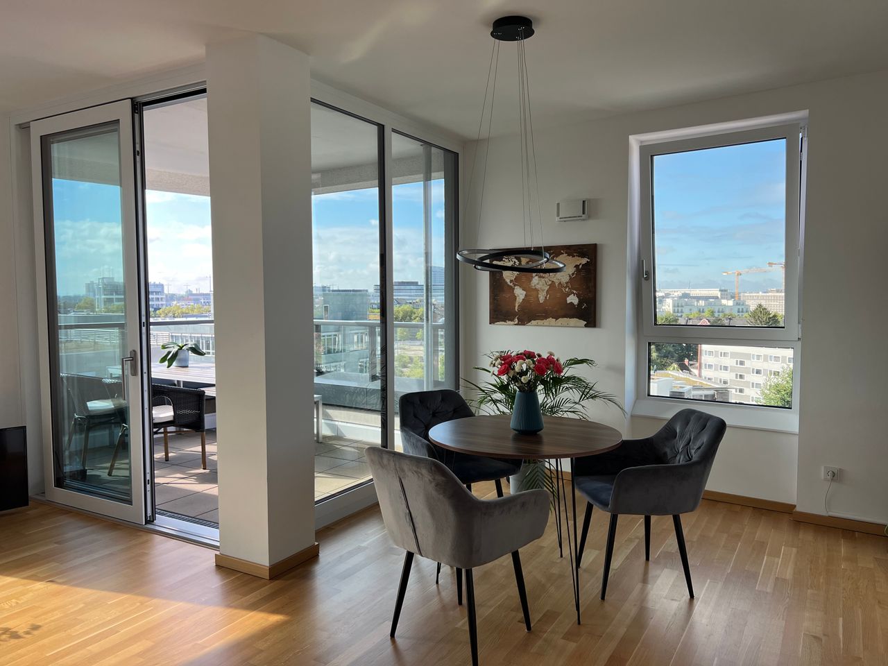 In dieser modernen und lichtdurchfluteten Wohnung werden Sie sich ganz sicher wohl fühlen. Sie befindet sich im 8. Stockwerk, zwei Aufzüge stehen Ihnen zur Verfügung, ein toller Ausblick und manchmal unvergessliche Sonnenuntergänge sind Ihnen hier garantiert. Ob U-Bahn Haltestelle, Bus-Haltestelle, Taxistand, Bäckereien, Supermarkt, gute Restaurants - alles befindet sich fussläufig, nur wenige Gehminuten entfernt. Die Wohnung eignet sich ideal, um von dort aus Düsseldorf und Umgebung zu erkunden...
