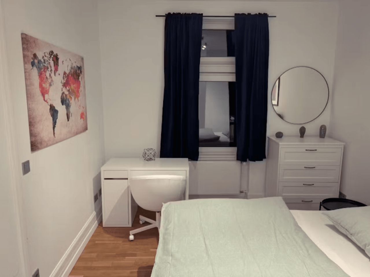 Bitte beachten Sie, dass die Reinigungsgebühr von 480 € + die Verwaltungsgebühr von 480 € VOR dem Einzug bezahlt werden müssen. Es handelt sich um einen unbefristeten Vertrag mit einer Kündigungsfrist von 1 Monat. Dies ist eines der 3 Schlafzimmer in der Wohnung. Das Zimmer ist mit einem Kingsize-Boxspringbett samt hochwertiger Bettwäsche sowie zwei Nachttischen, einer Kommode, einem Schreibtisch mit dazugehörigem Stuhl und einem großen Schrank mit Spiegel ausgestattet. Zusätzlich zu Ihrem eigen...