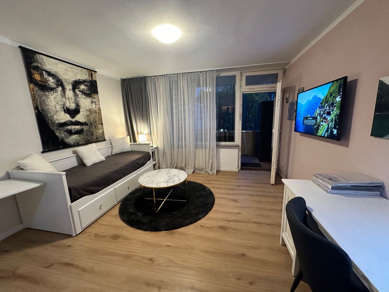 Kleines aber feines Apartment mit großem Balkon zum ruhigen Hof! Modernes Duschbad, Einbauküche mit Abzug, Herd, Mikrowelle, Kühlschrank und Waschmaschine. WLAN/WIFI