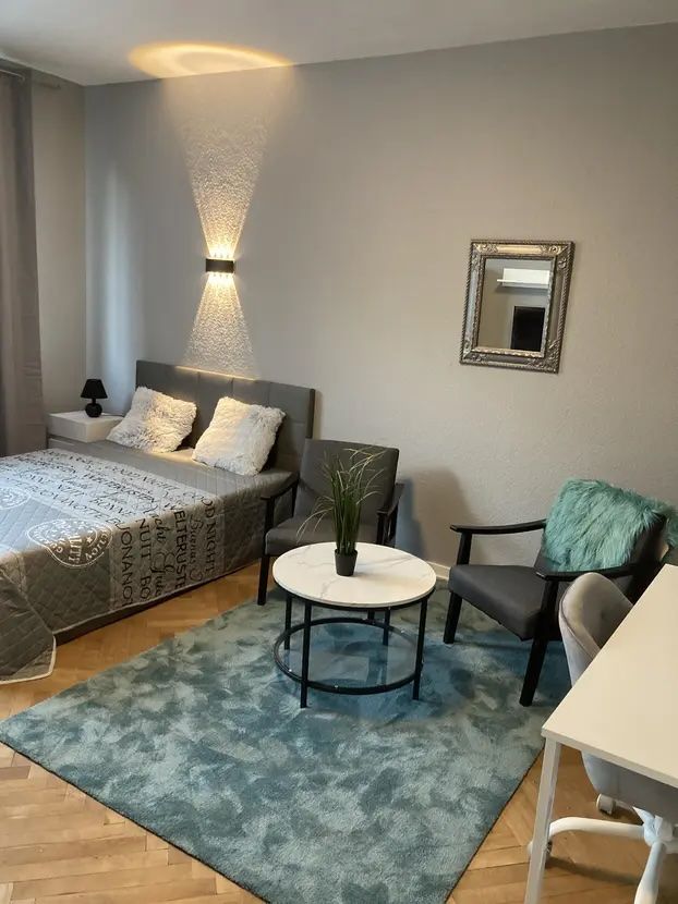 Diese stilvolle und sehr gemütlich eingerichtete 1-Zimmer-Wohnung bietet auf 35 m² ein ideales Zuhause für alle, die Komfort und eine zentrale Lage in Frankfurt schätzen. Das Wohn-Schlafzimmer überzeugt mit einem bequemen Bett, einem Couchtisch mit zwei Stühlen sowie einem Schreibtisch mit Stuhl – perfekt für Home Office. Ein Fernseher rundet den Raum ab und sorgt für entspannte Abende. Die separate Küche ist voll ausgestattet und bietet alles, was man zum Kochen braucht. Das moderne Badezimme...