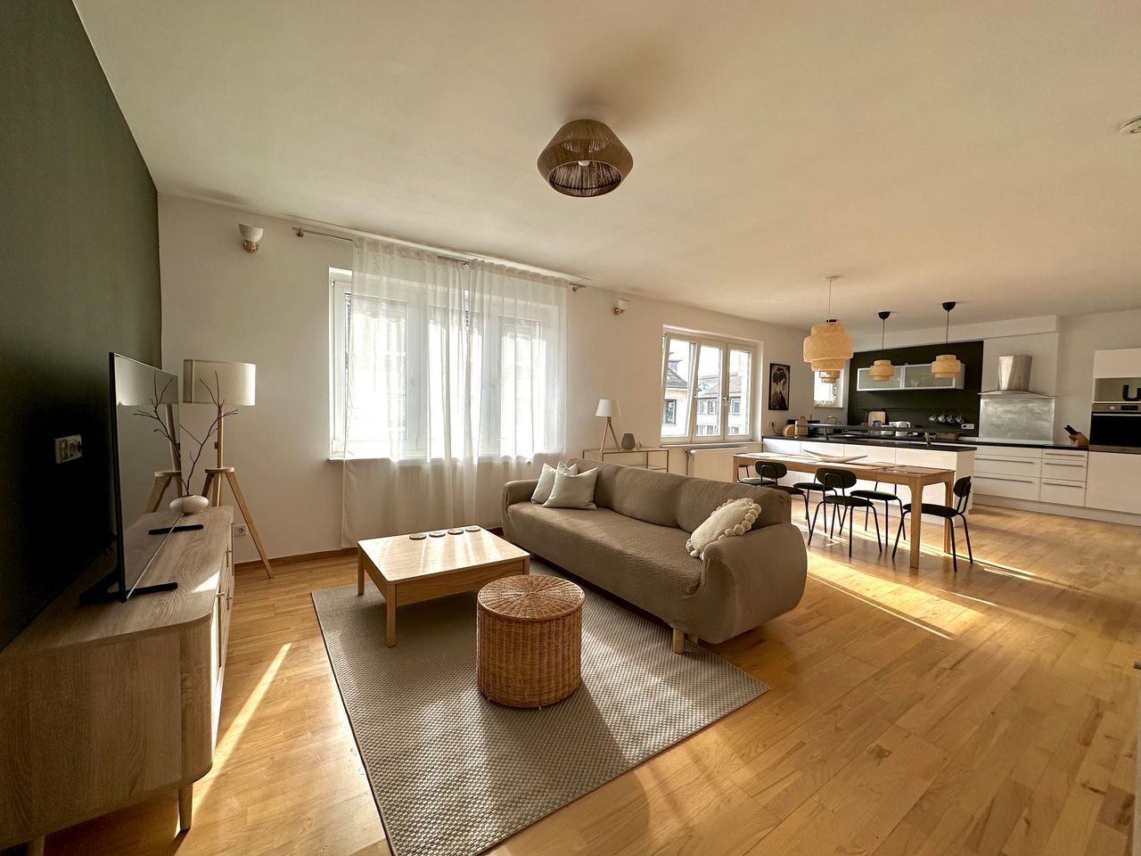 Die Wohnung verfügt über ein Schlafzimmer mit einem Kingsize-Bett, ein Arbeitszimmer mit Schreibtisch und einem Doppelschlafsofa, ein komplett ausgestattetes Badezimmer mit Badewanne, ein zweites Gäste-WC, eine voll ausgestattete Küche und einen begehbaren Kleiderschrank mit viel Stauraum.