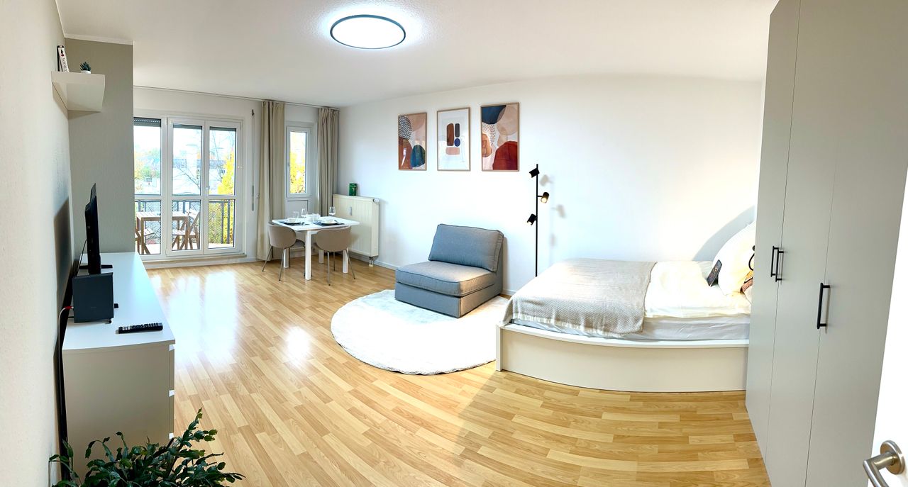 Besonderheiten: Die Wohnung ist geschmackvoll und hochwertig *neu* ausgestattet! - Bett 150x200cm, Bettwäsche, Matratze - Schrank 150cm breit für genügend Stauraum - Neue Küche mit komplett *allen* Küchenutensilien (bis hin zu Weingläsern) - Balkontisch mit Stühle - Smart TV (zum Verbinden von Android und iOS Handys) - ultraschnelles Internet 150Mbit/s, etc.) - Staubsauger, Bügeleisen, Bügelbrett, Wäscheständer, Handtücher - und noch vieles mehr! *Einfach mit Koffer ankommen und wohlfühlen!*...