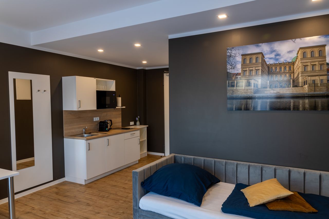 Die stilvoll eingerichteten Apartments sind mit einem Rundum-sorglos-Paket ausgestattet. Dazu gehört eine Küchenzeile (Kochfeld, Mikrowelle mit Grillfunktion, Kühlschrank) inkl. Geschirr, Gläsern und Besteck, ein Wasserkocher sowie einer Kaffeemaschine. Im Wohnbereich befindet sich ein Bett (100 cm x 200cm) inkl. Bettwäsche. Der geräumige Kleiderschrank und das Standregal bieten ausreichend Platz für Ihre privaten Gegenstände. Im Arbeitsbereich finden Sie einen Schreibtisch mit Stuhl, eine ...