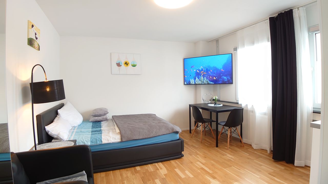 ie 2019 frisch renovierte Wohnung befindet sich in der 3. Etage mit Aufzug eines Mehrfamilien-Hauses. Sie teilt sich mit dem Apartment nebenan einen kleinen Flur, in dem sich die Waschmaschine befindet, die ebenfalls geteilt wird. Das Zimmer verfügt über ein Bett (1,40x2m), einen Sessel, einen Kleiderschrank, einen Smart-TV, eine kleine Essecke sowie eine Kitchenette mit kleiner Spülmaschine, Wasserkocher, Kaffeemaschine. Mikrowelle, Induktionskochplatte und Kücheninventar. Das hochwertige Tages...