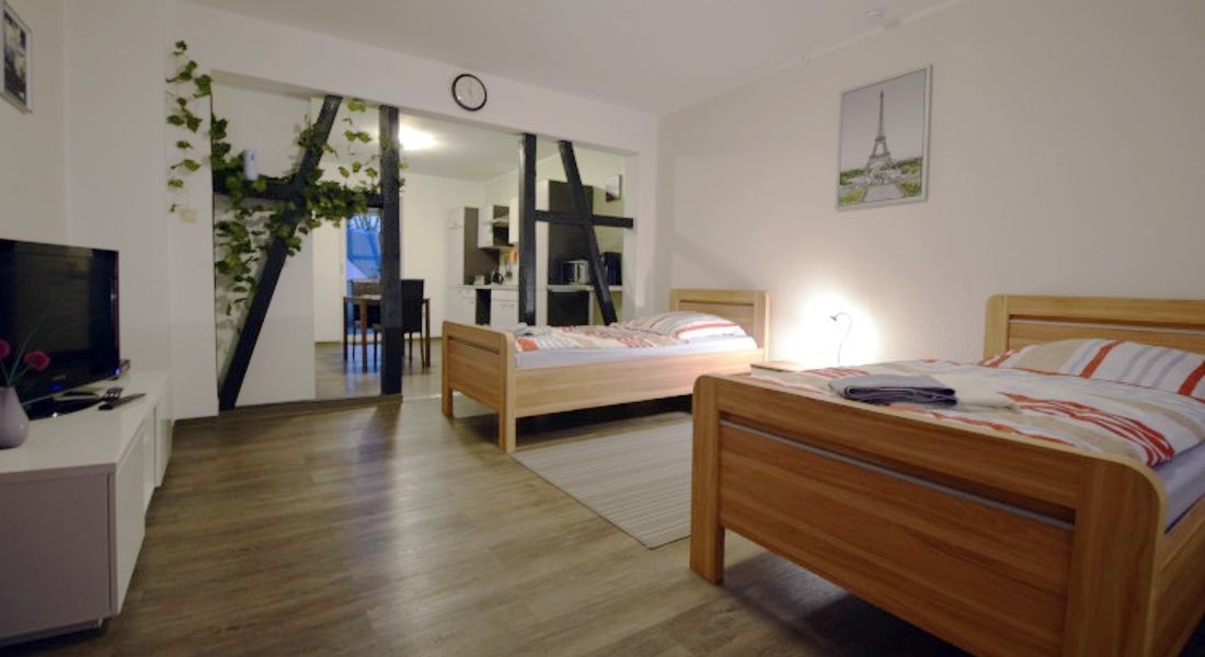 This spacious 1-room apartment on the first floor offers 45 m² of comfortable living space and is perfect for fitters, business travelers, or visitors to Bochum. The combined living, sleeping, and dining area includes two comfortable single beds, a dining table, and a TV. A fully equipped kitchenette allows you to prepare your own meals, while the bathroom features a bathtub with shower attachment and a toilet. Free Wi-Fi is available. Smoking is only permitted on the balcony; the apartment its...