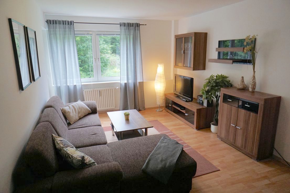 51 sqm with 2 rooms, kitchen and bathroom. The spacious living room with sofa invites to relax after work. From here you also have access to the balcony with a green view. A desk in the living room makes it easy for you to work from home. The bedroom has a comfortable double bed for a restful sleep. A large wardrobe offers enough space for your clothes even during a longer stay. Here you will also find iron and ironing board. The fully equipped kitchen with dining area makes it easy to prepare...