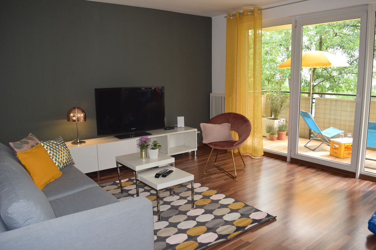 The flat is located on the second floor of an idyllic and quiet block of flats on the Stralau peninsula in the middle of Berlin. The flat consists of a living room, a bedroom with a double bed (1.60 m x 2.00 m), a kitchen with dining area and a bathroom. The flat is ideal for 2 people. The kitchen is fully equipped with the most important kitchen utensils: refrigerator with freezer, coffee maker, kettle, microwave, dishwasher with dishwasher tabs, toaster, crockery, cutlery, pots, etc. The bat...