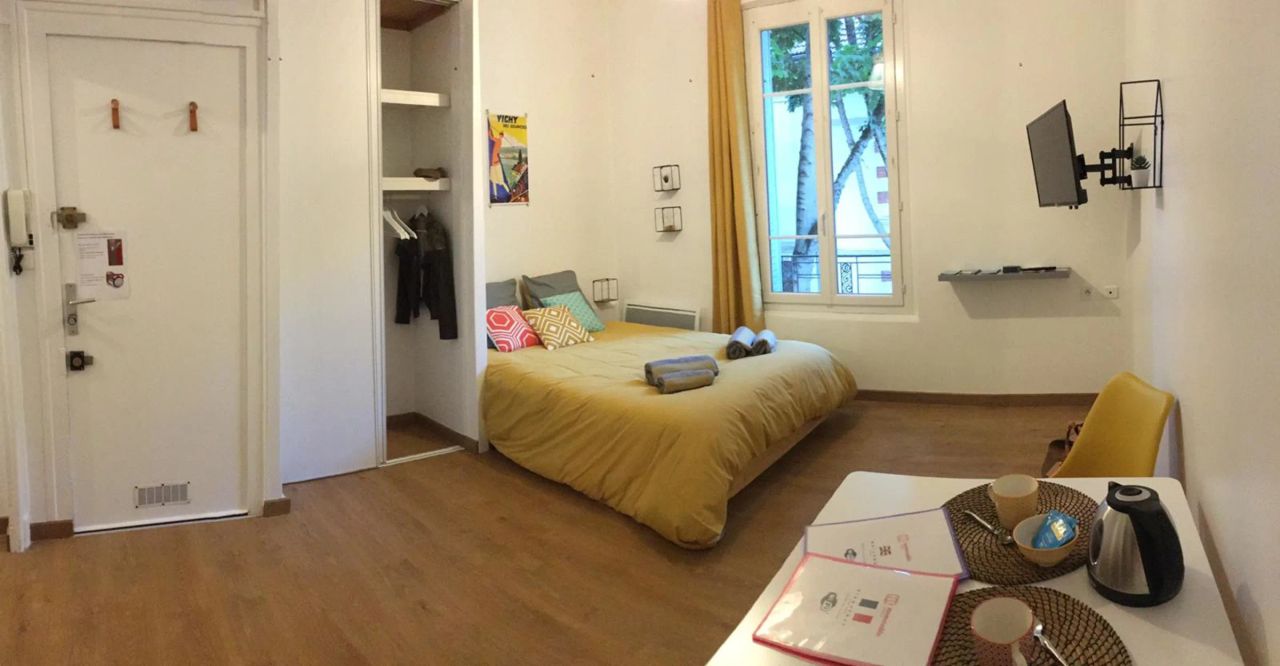 This apartment has a comfortable double bed, a modern fully equipped kitchen, a nice bathroom with shower. There is also a flat screen TV and WIFI available in the whole apartment. We provide you with courtesy products (rice, pasta...). The entry in the premises is easy and fast from 3 pm thanks to a connected lock. The departure is possible until 11 am.