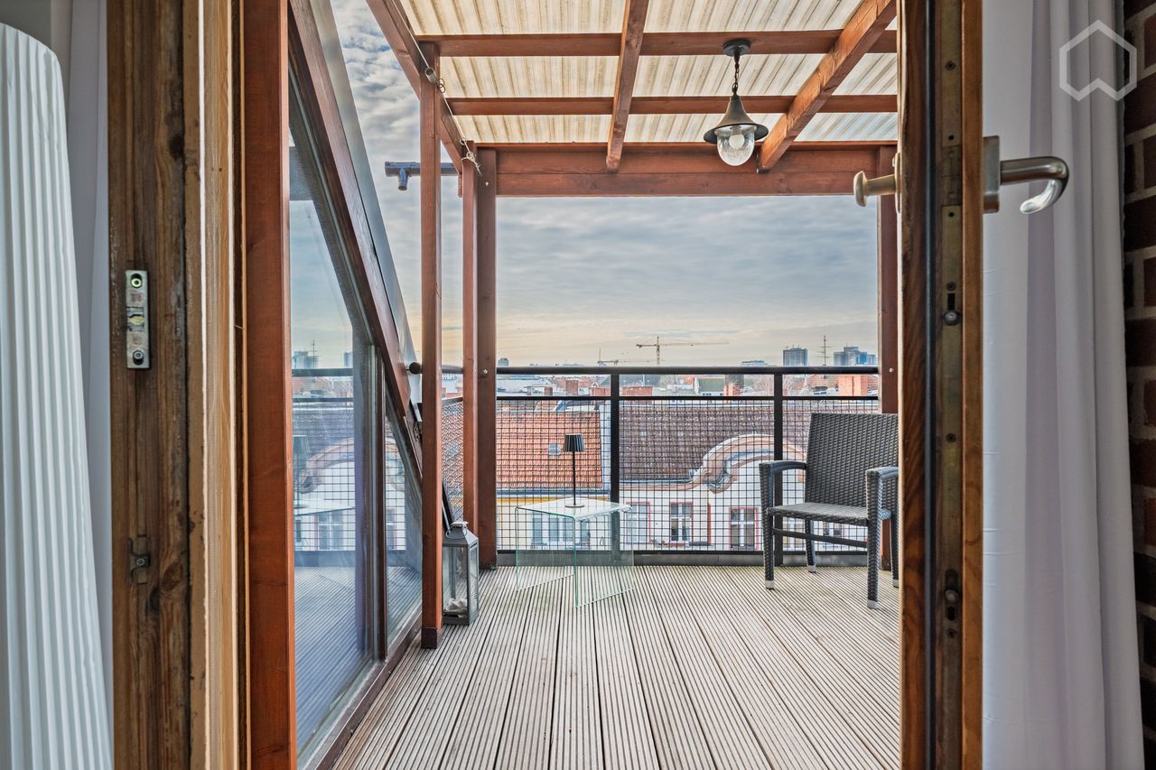 This charming loft apartment on the 7th floor combines tranquillity with big-city flair. On the roof terrace, you can let your gaze wander into the distance and relax wonderfully, while the high-quality furnishings with parquet flooring, floor-to-ceiling terrace windows and natural stone tiles in the bathroom ensure a cosy living atmosphere. Thanks to the complete furnishings and equipment – from the kitchen and bathroom with washing machine and dryer to WiFi – you can simply move in and enjoy B...