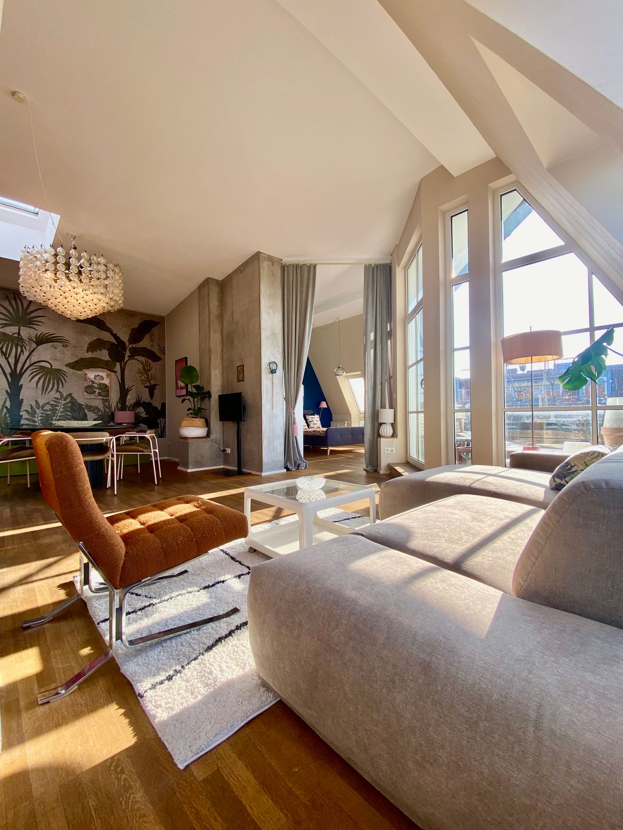 Lovingly furnished loft in a class of its own on the banks of the Spree in Kreuzberg. The loft is 78 square meters in size, has very high ceilings and beautiful oak parquet flooring. It is flooded with sunlight and completely glazed on 2 sides. There is a lovely large south-facing terrace with evening sun. The bathroom is very spacious with a bathtub and a skylight. The apartment is modernly furnished with a touch of midcentury design. It is the perfect place for city romantics! The place to b...