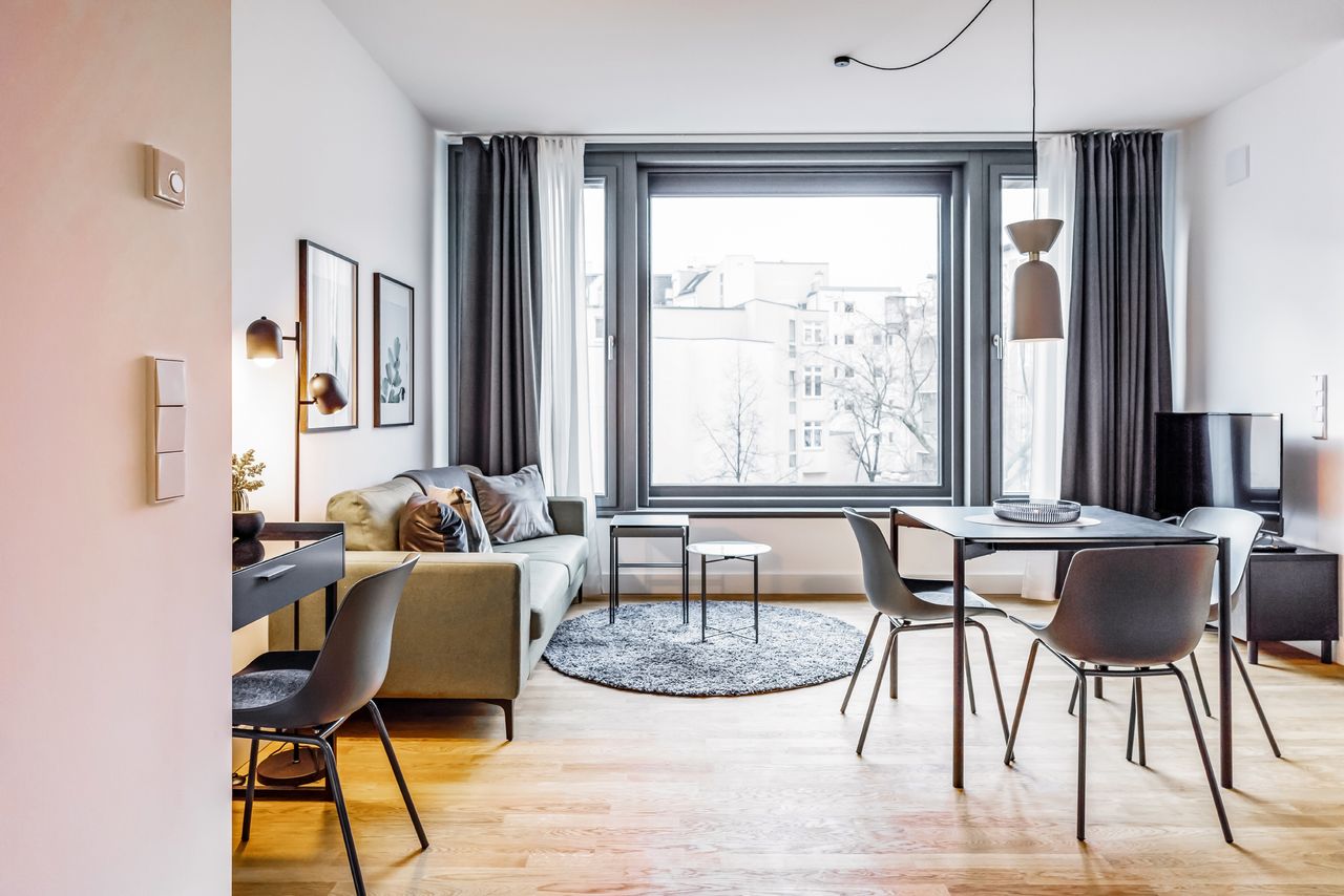 This beautiful studio apartment is located in the heart of Berlin, in a well-designed and newly built building. The apartment is fully furnished and equipped with everything you need, including bed linens, towels, and kitchen appliances. It is divided into a sleeping area and a hosting area, making it perfect for both living and entertaining. The apartment also has a small gym and elevator, making it the perfect place to call home.