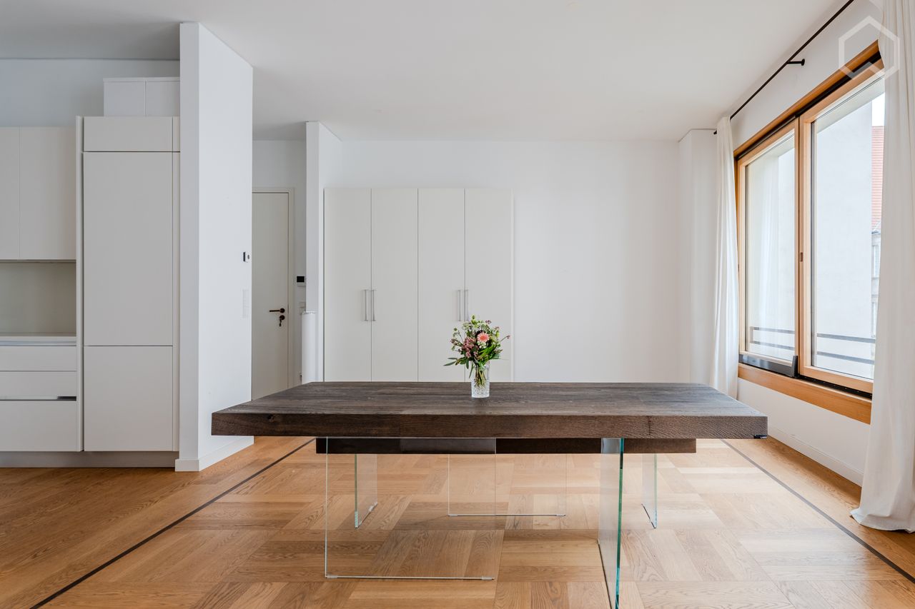 This luxurious apartment by star architect David Chipperfield in central Berlin-Mitte welcomes you with a spacious entrance, from which you enter the impressive living and dining area. A true highlight are the large panoramic windows with elegant natural wood frames, which span the entire width of the modern city apartment and provide plenty of light and unique views in every season. High ceilings and elegant real wood floors throughout create a cozy yet luxurious living atmosphere. The spacious...
